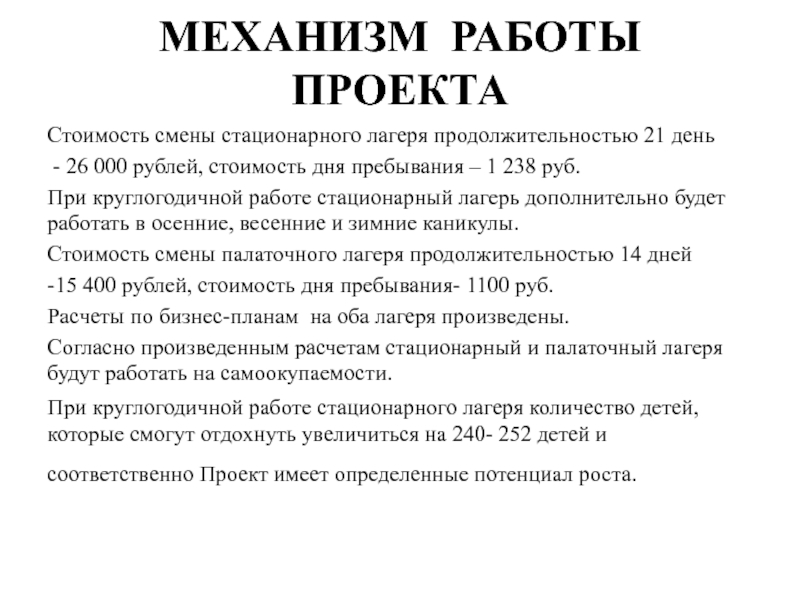 При круглогодичной работе стационарного лагеря количество детей, которые смогут отдохнуть увеличиться на 240- 252 детей и соответственно Проект имеет определенные потенциал роста.