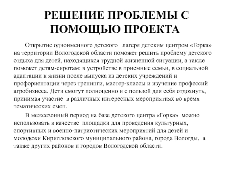 лагеря детским центром «Горка» на территории Вологодской области поможет решить