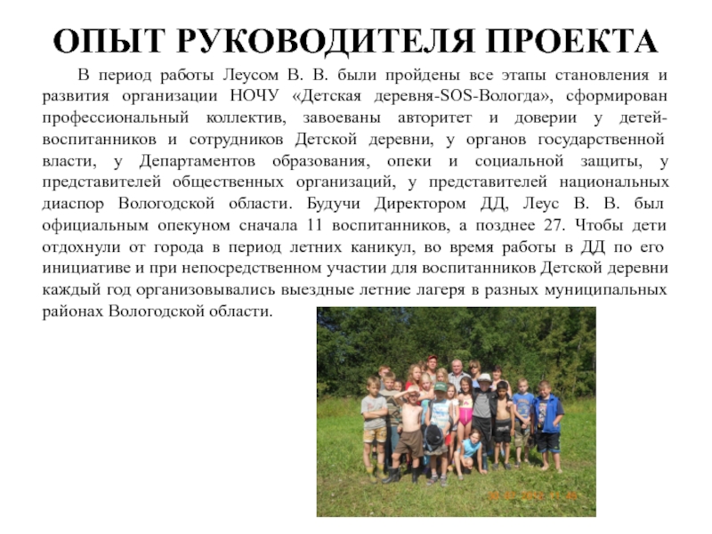 профессиональный коллектив, завоеваны авторитет и доверии у детей-воспитанников и сотрудников Детской деревни, у органов государственной власти, у Департаментов образования, опеки и социальной защиты, у представителей общественных организаций, у представителей национальных диаспор Вологодской области. Будучи Директором ДД, Леус В. В. был официальным опекуном сначала 11 воспитанников, а позднее 27. Чтобы дети отдохнули от города в период летних каникул, во время работы в ДД по его инициативе и при непосредственном участии для воспитанников Детской деревни каждый год организовывались выездные летние лагеря в разных муниципальных районах Вологодской области.