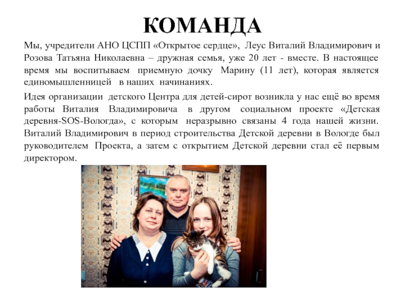 Идея организации детского Центра для детей-сирот возникла у нас ещё во время работы Виталия Владимировича в другом социальном проекте «Детская деревня-SOS-Вологда», с которым неразрывно связаны 4 года нашей жизни. Виталий Владимирович в период строительства Детской деревни в Вологде был руководителем Проекта, а затем с открытием Детской деревни стал её первым директором.