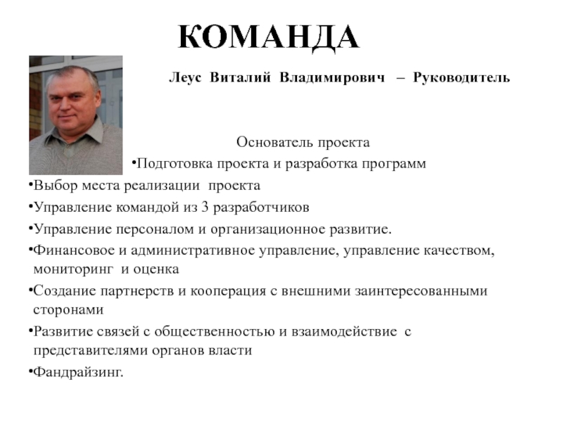 Леус Виталий Владимирович – Руководитель Проекта