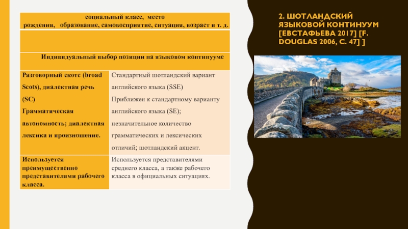 Слайд 82. Шотландский языковой континуум [Евстафьева 2017] [F. Douglas 2006, с.