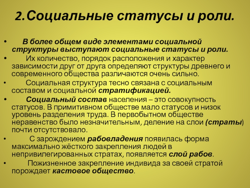 Социальный состав населения – это совокупность статусов. В примитивном обществе мало статусов и низок уровень разделения труда. В первобытном обществе неравенство было незначительным, деление на слои (страты) почти отсутствовало.