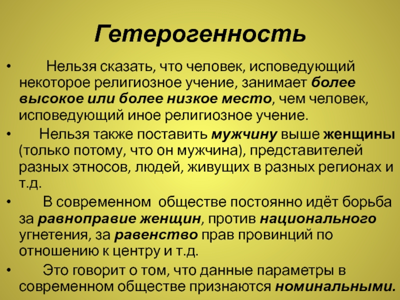 Нельзя также поставить мужчину выше женщины (только потому, что он мужчина), представителей разных этносов, людей, живущих в разных регионах и т.д.