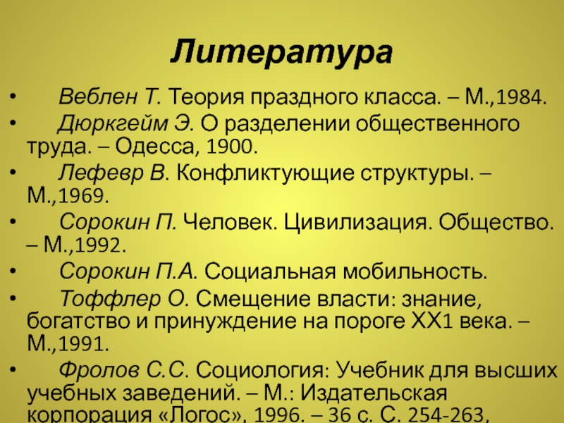 Фролов С.С. Социология: Учебник для высших учебных заведений. – М.: Издательская корпорация «Логос», 1996. – 36 с. С. 254-263, 317-322.