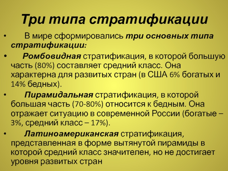 Пирамидальная стратификация, в которой большая часть (70-80%) относится к бедным. Она отражает ситуацию в современной России (богатые – 3%, средний класс – 17%).