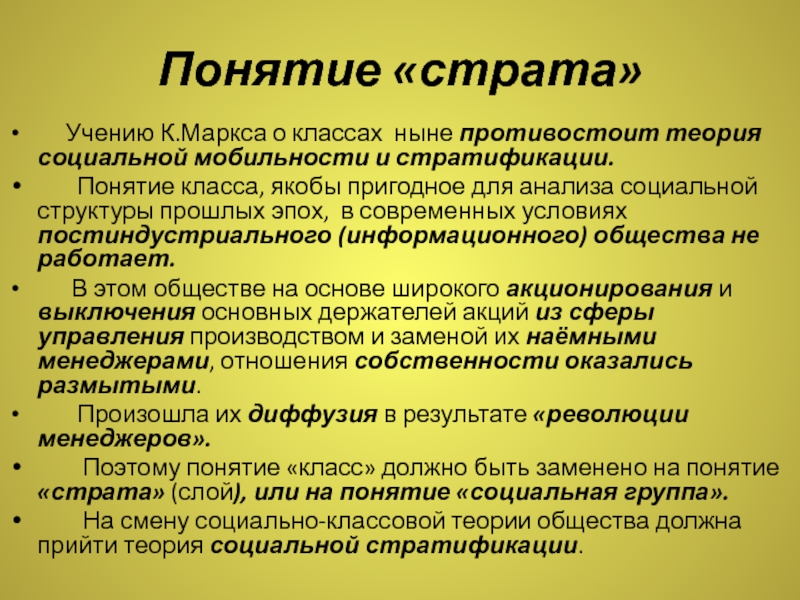 Поэтому понятие «класс» должно быть заменено на понятие «страта» (слой), или на понятие «социальная группа».