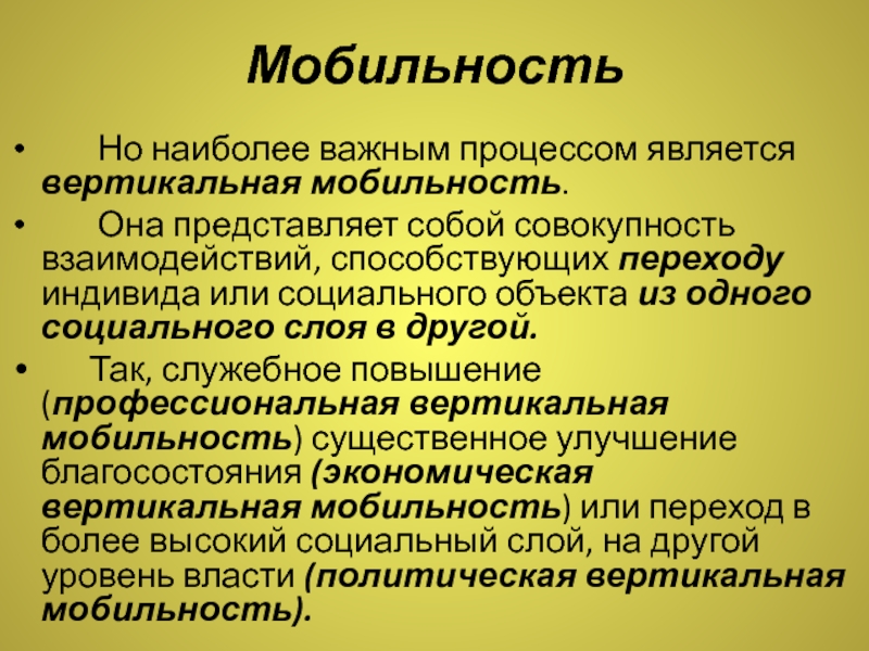 Так, служебное повышение (профессиональная вертикальная мобильность) существенное улучшение благосостояния (экономическая вертикальная мобильность) или переход в более высокий социальный слой, на другой уровень власти (политическая вертикальная мобильность).