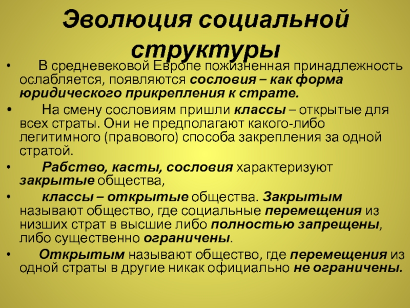 классы – открытые общества. Закрытым называют общество, где социальные перемещения из низших страт в высшие либо полностью запрещены, либо существенно ограничены.