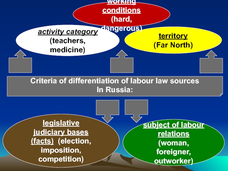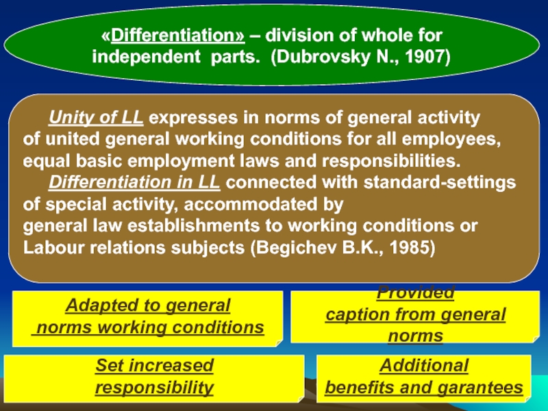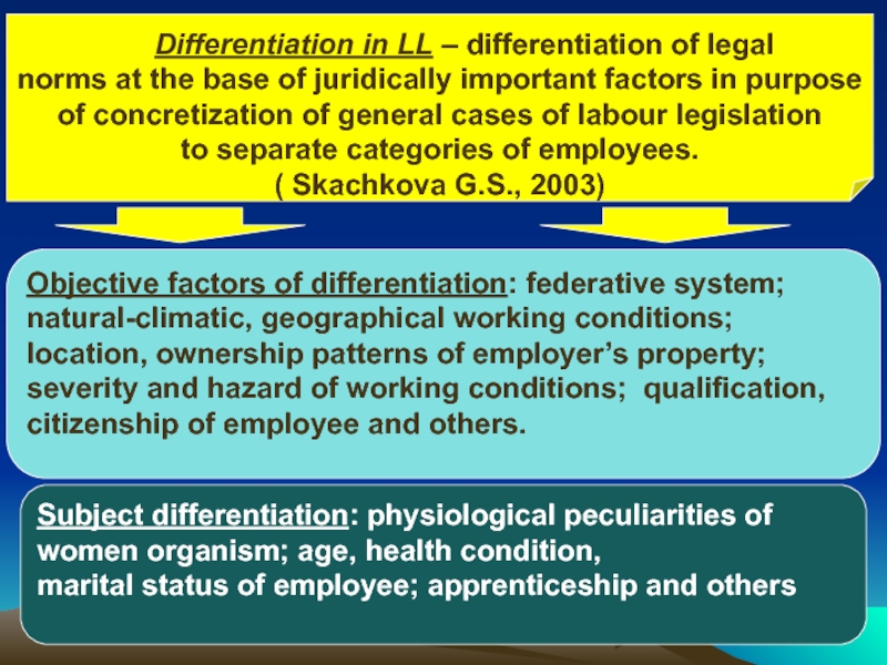 Objective factors of differentiation: federative system; natural-climatic, geographical working conditions; location, ownership patterns of employer’s property; severity and hazard of working conditions; qualification, citizenship of employee and others.