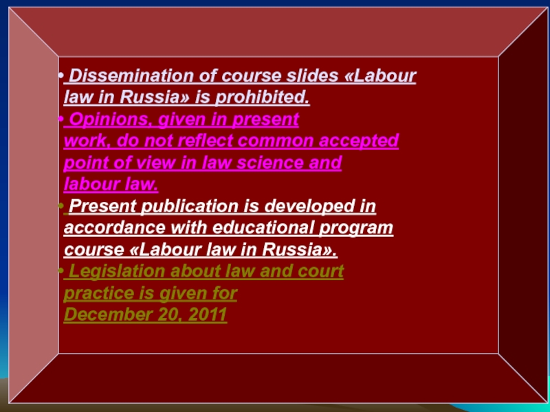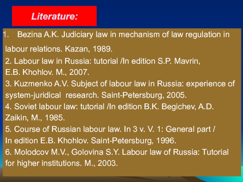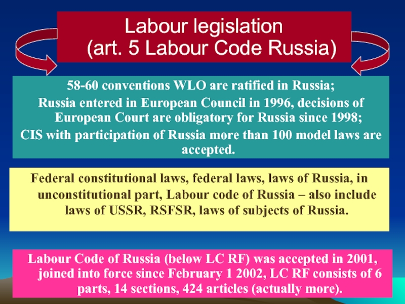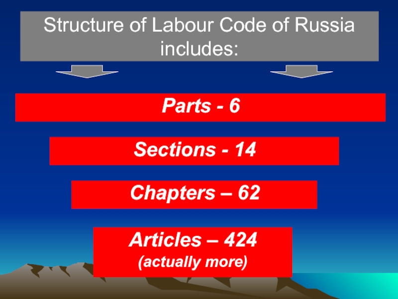 Labour Code of Russia (below LC RF) was accepted in 2001, joined into force since February 1 2002, LC RF consists of 6 parts, 14 sections, 424 articles (actually more).