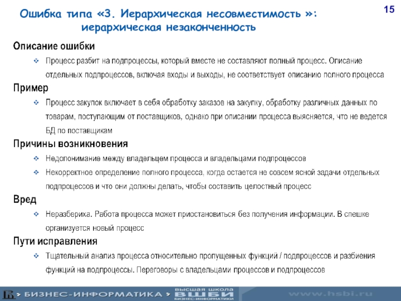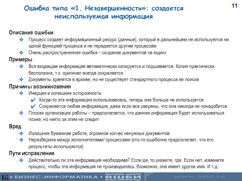 Слайд 11Ошибка типа «1. Незавершенность»: создается неиспользуемая информация