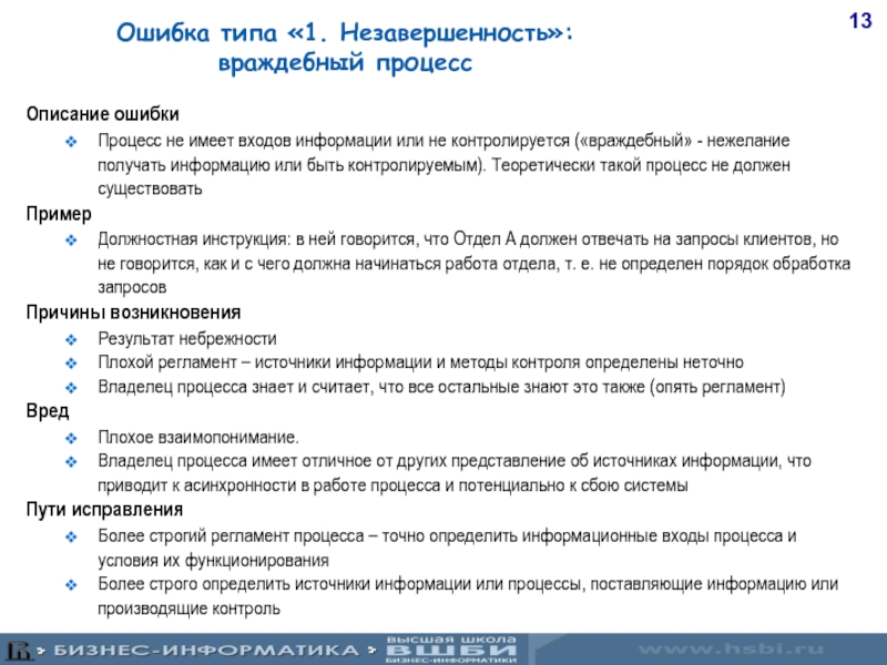 Слайд 13Ошибка типа «1. Незавершенность»: враждебный процесс