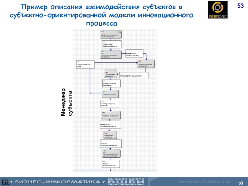 Слайд 53Пример описания взаимодействия субъектов в субъектно-ориентированной модели инновационного процесса