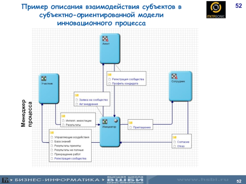 Слайд 52Пример описания взаимодействия субъектов в субъектно-ориентированной модели инновационного процесса