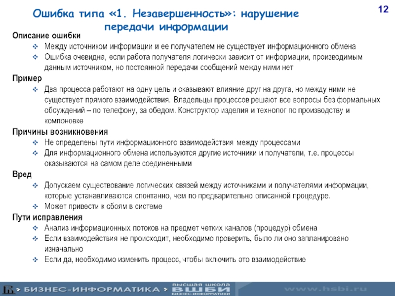 Слайд 12Ошибка типа «1. Незавершенность»: нарушение передачи информации