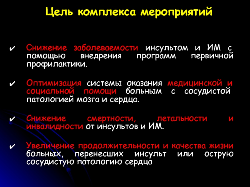 Снижение смертности, летальности и инвалидности от инсультов и ИМ.