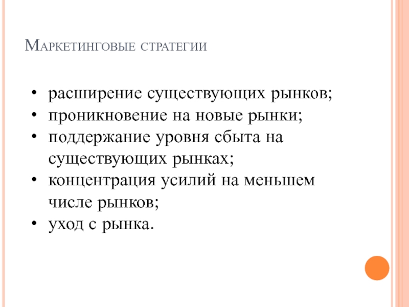 Маркетинговые стратегии расширение существующих рынков;проникновение на новые рынки;поддержание уровня сбыта на существующих рынках;концентрация усилий на меньшем числе