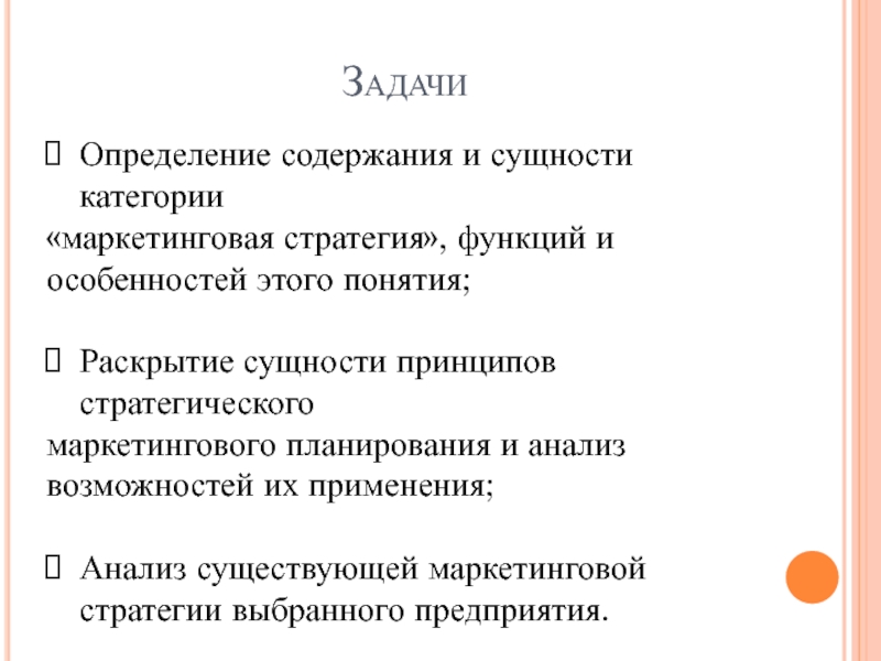 Задачи Определение содержания и сущности категории«маркетинговая стратегия», функций и особенностей этого понятия;Раскрытие сущности принципов стратегическогомаркетингового планирования и