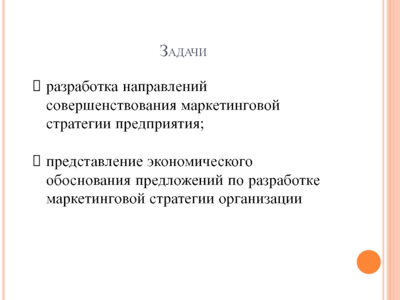 Задачиразработка направлений совершенствования маркетинговой стратегии предприятия;представление экономического обоснования предложений по разработке маркетинговой стратегии организации