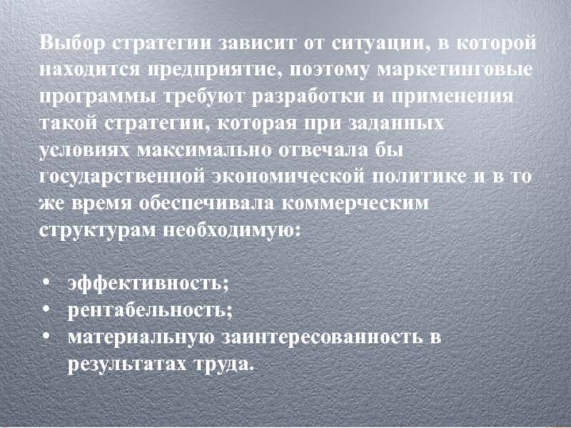Слайд 6Выбор стратегии зависит от ситуации, в которой находится предприятие, поэтому