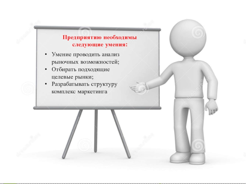 Предприятию необходимы следующие умения:Умение проводить анализ рыночных возможностей;Отбирать подходящие целевые рынки;Разрабатывать структуру комплекс маркетинга