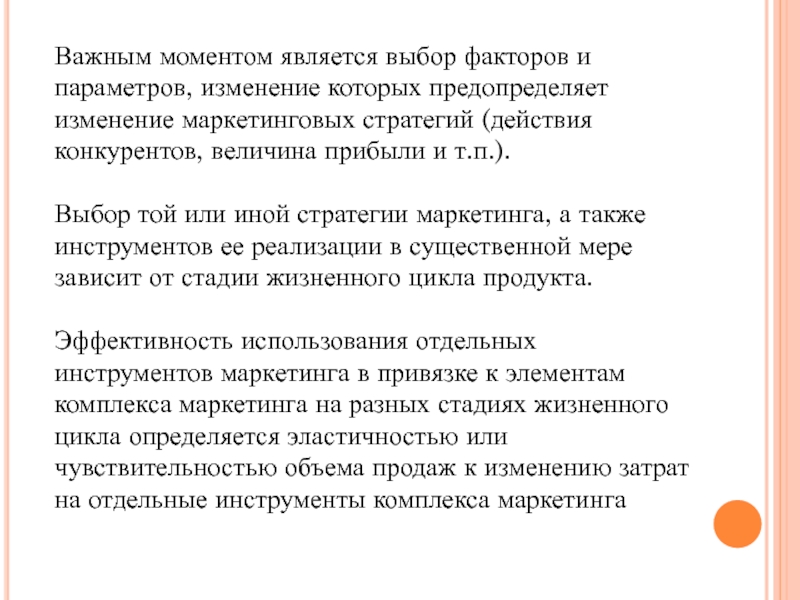 Важным моментом является выбор факторов и параметров, изменение которых предопределяет изменение маркетинговых стратегий (действия конкурентов, величина прибыли