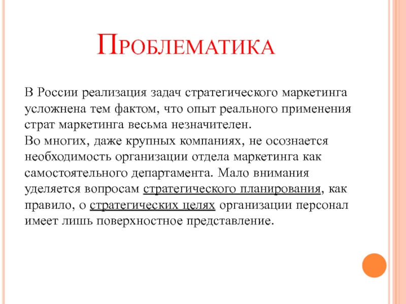 Проблематика В России реализация задач стратегического маркетинга усложнена тем фактом, что опыт реального применения страт маркетинга весьма