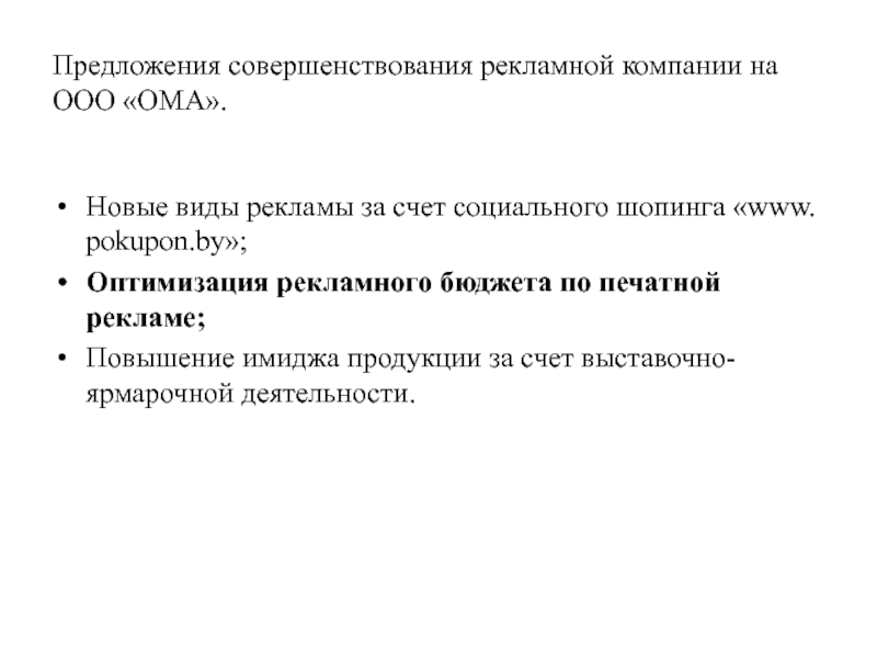 Предложения совершенствования рекламной компании на ООО «ОМА».Новые виды рекламы за счет социального шопинга «www. pokupon.by»;Оптимизация рекламного бюджета
