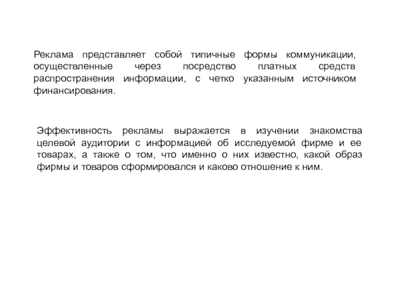 Слайд 2Реклама представляет собой типичные формы коммуникации, осуществленные через посредство платных