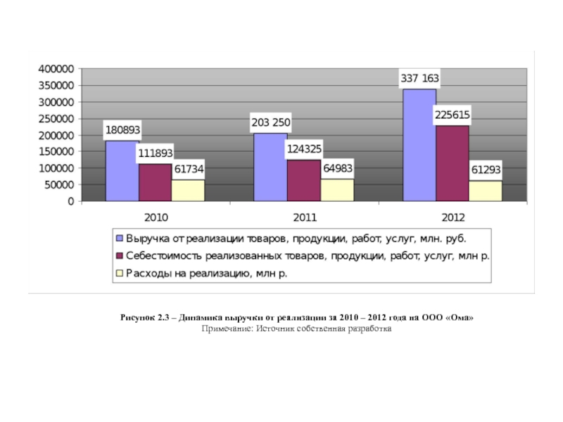 Рисунок 2.3 – Динамика выручки от реализации за 2010 – 2012 года на ООО «Ома» Примечание: Источник