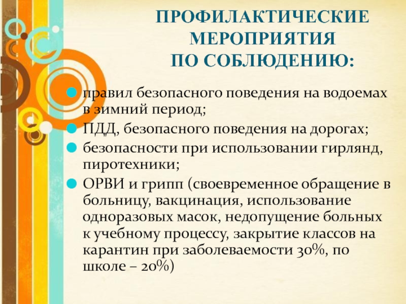 грипп (своевременное обращение в больницу, вакцинация, использование одноразовых масок, недопущение больных к учебному процессу, закрытие классов на карантин при заболеваемости 30%, по школе – 20%)