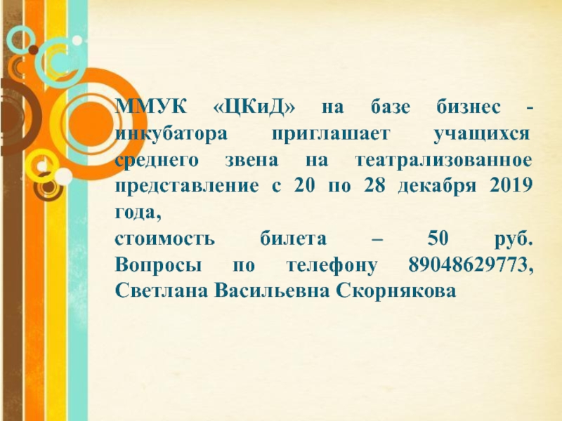 Слайд 11ММУК «ЦКиД» на базе бизнес - инкубатора приглашает учащихся среднего