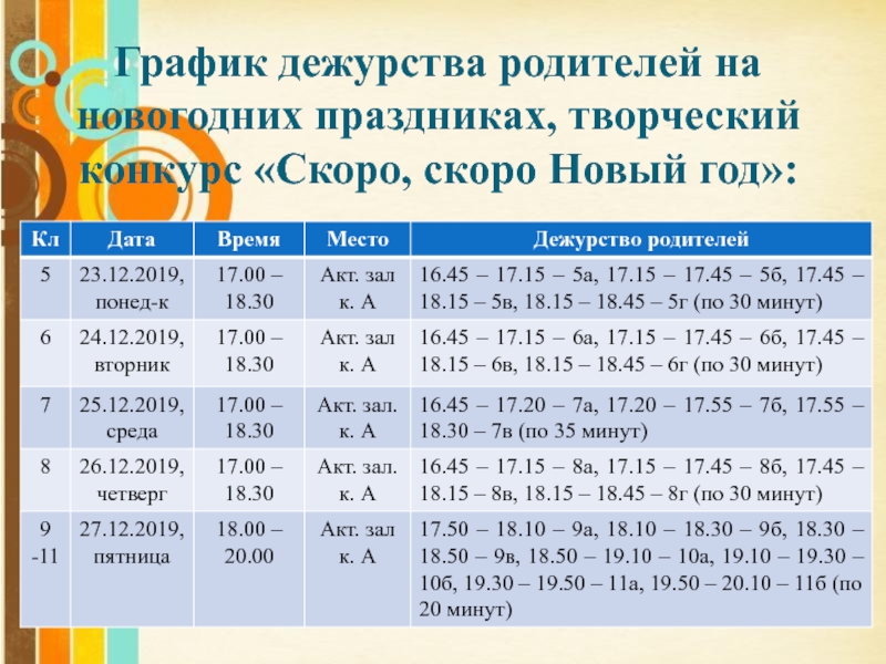 Слайд 10График дежурства родителей на новогодних праздниках, творческий конкурс «Скоро, скоро