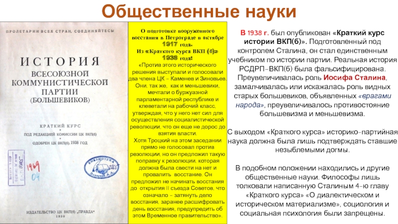В подобном положении находились и другие общественные науки. Философы лишь толковали написанную Сталиным 4-ю главу «Краткого курса» «О диалектическом и историческом материализме», социология и социальная психология были запрещены.