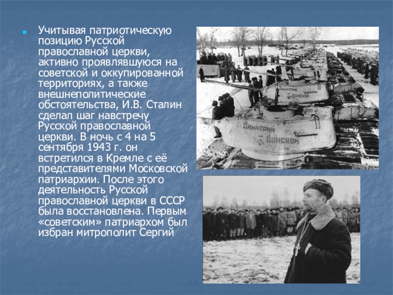 Слайд 21Учитывая патриотическую позицию Русской православной церкви, активно проявлявшуюся на советской