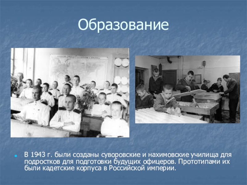 В 1943 г. были созданы суворовские и нахимовские училища для