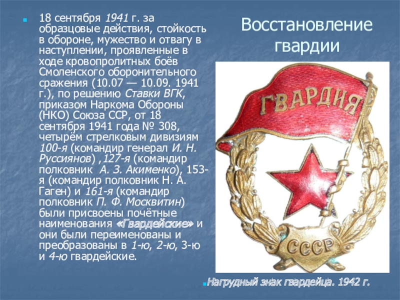 боёв Смоленского оборонительного сражения (10.07 — 10.09. 1941 г.), по решению Ставки ВГК, приказом Наркома Обороны (НКО) Союза ССР, от 18 сентября 1941 года № 308, четырём стрелковым дивизиям 100-я (командир генерал И. Н. Руссиянов) ,127-я (командир полковник А. З. Акименко), 153-я (командир полковник Н. А. Гаген) и 161-я (командир полковник П. Ф. Москвитин) были присвоены почётные наименования «Гвардейские» и они были переименованы и преобразованы в 1-ю, 2-ю, 3-ю и 4-ю гвардейские.