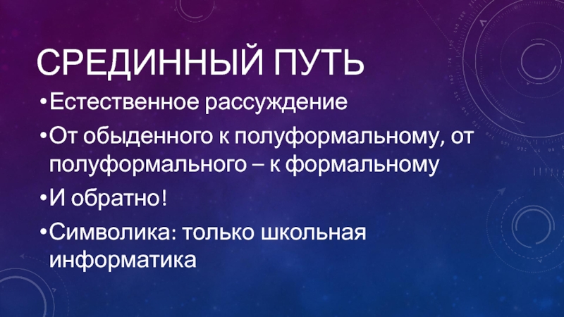 Срединный путьЕстественное рассуждениеОт обыденного к полуформальному, от полуформального – к формальному И обратно! Символика: только школьная информатика