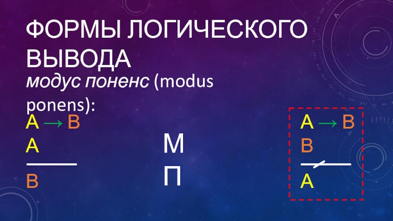 Формы логического выводамодус поненс (modus ponens):А → ВАВ А → В В А МП