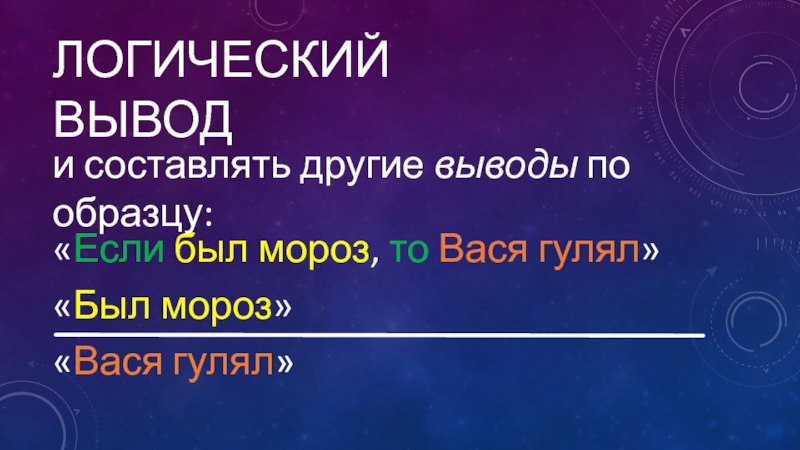 Логический выводи составлять другие выводы по образцу:«Если был мороз, то Вася гулял»«Был мороз»«Вася гулял»
