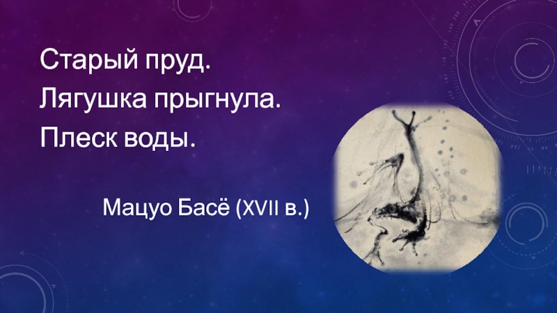 Старый пруд.Лягушка прыгнула.Плеск воды.         Мацуо Басё (XVII в.)