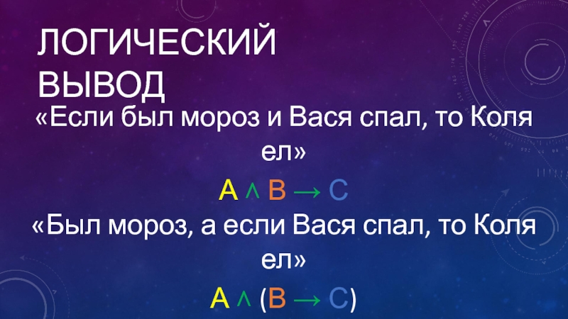 Логический вывод«Если был мороз и Вася спал, то Коля ел»А ˄ В → С«Был мороз, а если