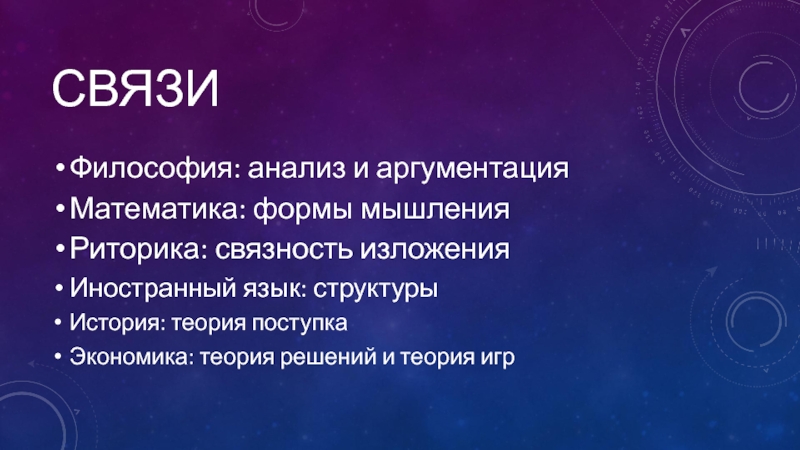 СвязиФилософия: анализ и аргументацияМатематика: формы мышленияРиторика: связность изложения Иностранный язык: структурыИстория: теория поступкаЭкономика: теория решений и теория