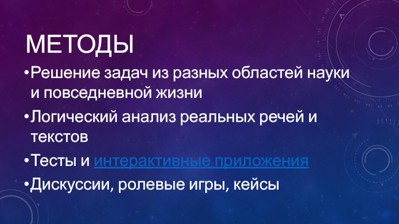 МетодыРешение задач из разных областей науки и повседневной жизниЛогический анализ реальных речей и текстовТесты и интерактивные приложения