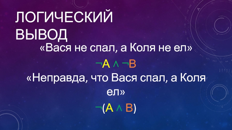Логический вывод«Вася не спал, а Коля не е뻬А ˄ ¬В«Неправда, что Вася спал, а Коля е뻬(А ˄
