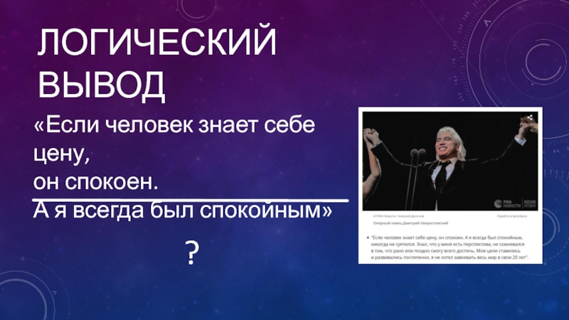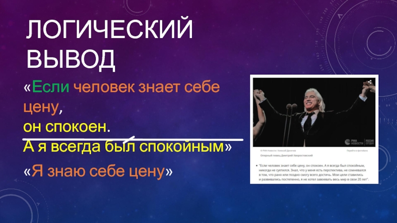 Логический вывод«Если человек знает себе цену, он спокоен. А я всегда был спокойным»«Я знаю себе цену»