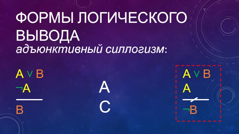 Формы логического выводаадъюнктивный силлогизм:А ˅ В¬АВ А ˅ В А ¬В АС