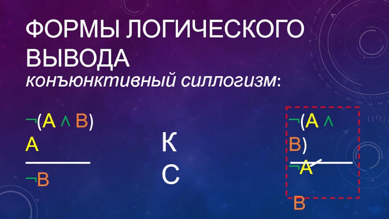 Формы логического выводаконъюнктивный силлогизм:¬(А ˄ В)А¬В¬(А ˄ В)¬А В КС