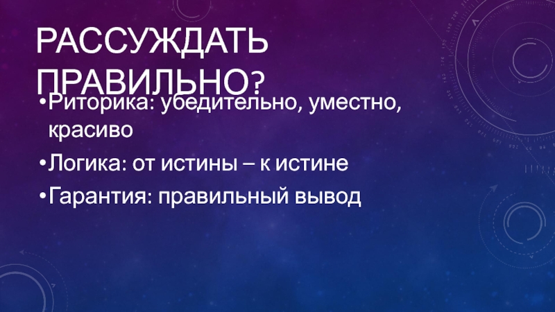 Риторика: убедительно, уместно, красивоЛогика: от истины – к истине Гарантия: правильный выводРассуждать правильно?